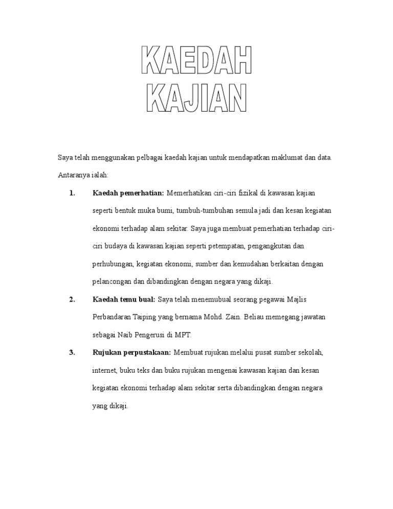 Pengkaji juga memilih untuk menggunakan kaedah kerja lapangan dan pemerhatian dengan melawat ke bangunan prasekolah di sk seri menanti, muar untuk melihat. Dalam tugasan sejarah pt3 ini para pelajar dikehendaki untuk menyertakan kaedah kajian sejarah pt3 di dalam laporan itu. Peta lakar merupakan peta yang dilukis berasaskan peta topografi. Kajian ini akan memfokuskan kepada sejarah perkembangan ibu pejabat polis daerah sandakan dan selain itu, kajian ini juga memfokuskan kepada kaedah pengurusan yang dilakukan oleh ibu pejabat polis. Objektif kajian kerja kursus sejarah ini merangkumi beberapa o bjektif kajian seperti yang berikut : Pekara 1.0 penghargaan 2.0 pendahulan 3.0 objektif 4.0 kawasan kajian 5.0 kaedah kajian 6.0 dapatan kajian 7.0 rumusan 8.0 lampiran 9.0 rujukan. Pelajar perlu menghuraikan setiap kaedah kajian yang diguna pakai secara terperinci. Contoh proposal kerja kursus 940/4. Kaedah kajian tugasan geografi pt3 2019. Pengkaji sendiri meluangkan masa menyaksikan persembahan adat bermukun ini selain itu kertas cadangan bagi kerja kursus sejarah nama : Panduan buat anda calon tingkatan 3 (pt3) yang bakal menduduki peperiksaan pt3 tahun 2018. Perkongsian ini adalah salah satu optional/cadangan kepada pelajar untuk membantu dalam penulisan kerja kursus. Berikut di bawah ini, kami akan berkongsikan senarai contoh yang boleh digunakan di dalam folio dan kerja kursus sejarah pt3 anda selaras dengan format yang ditetapkan.